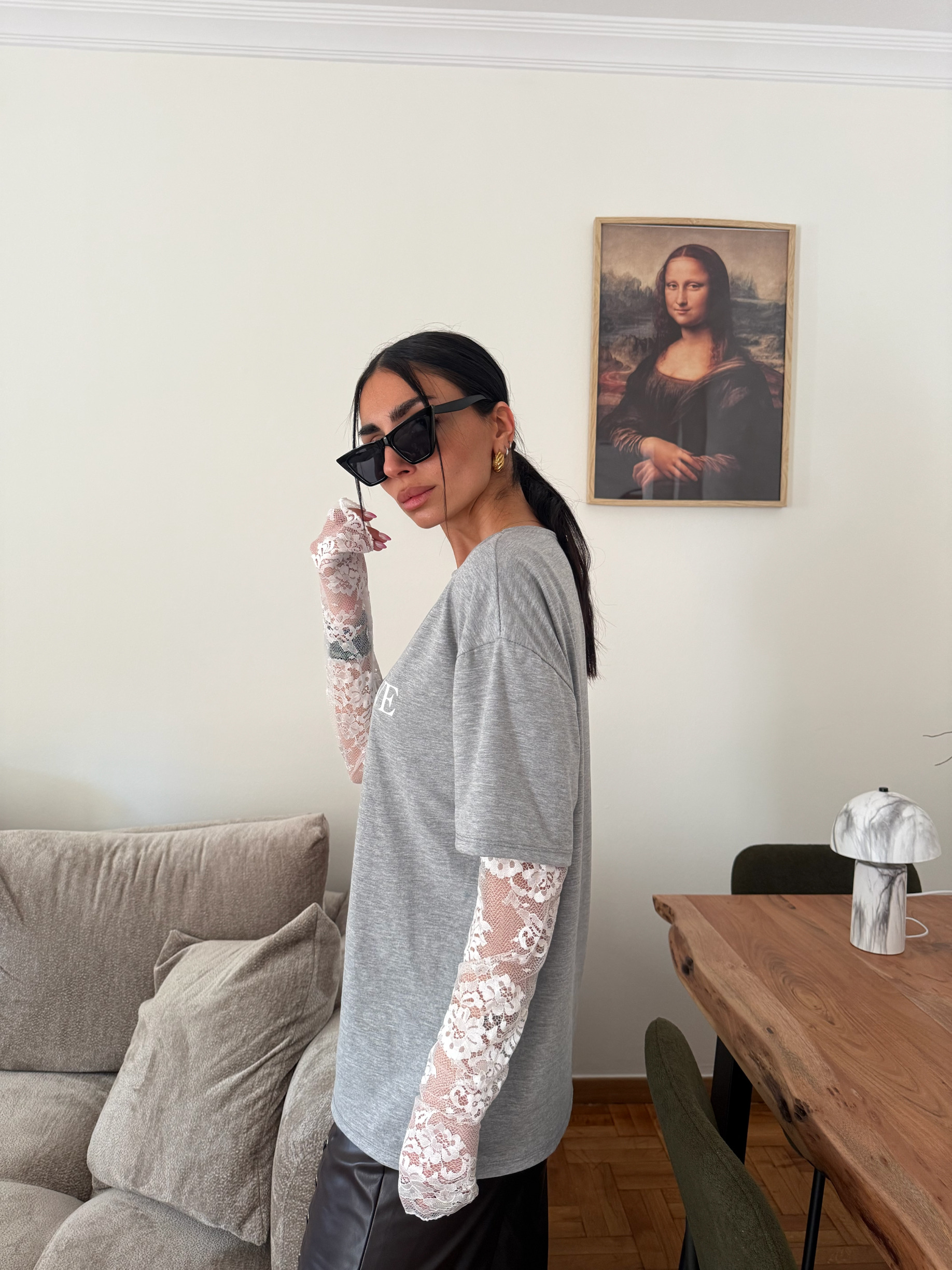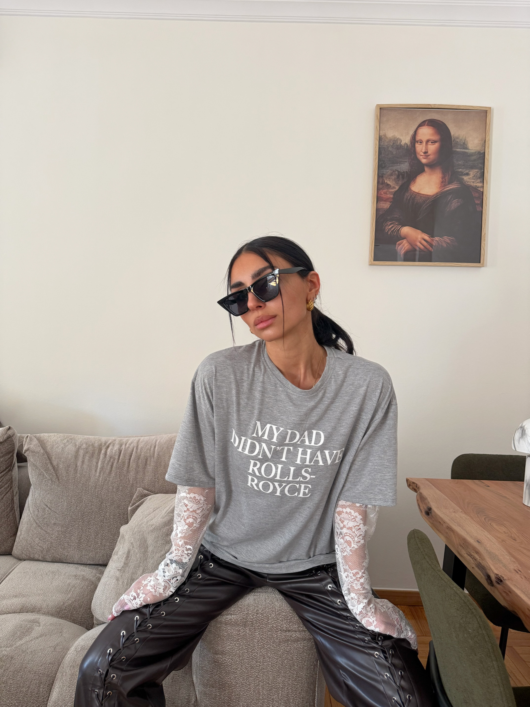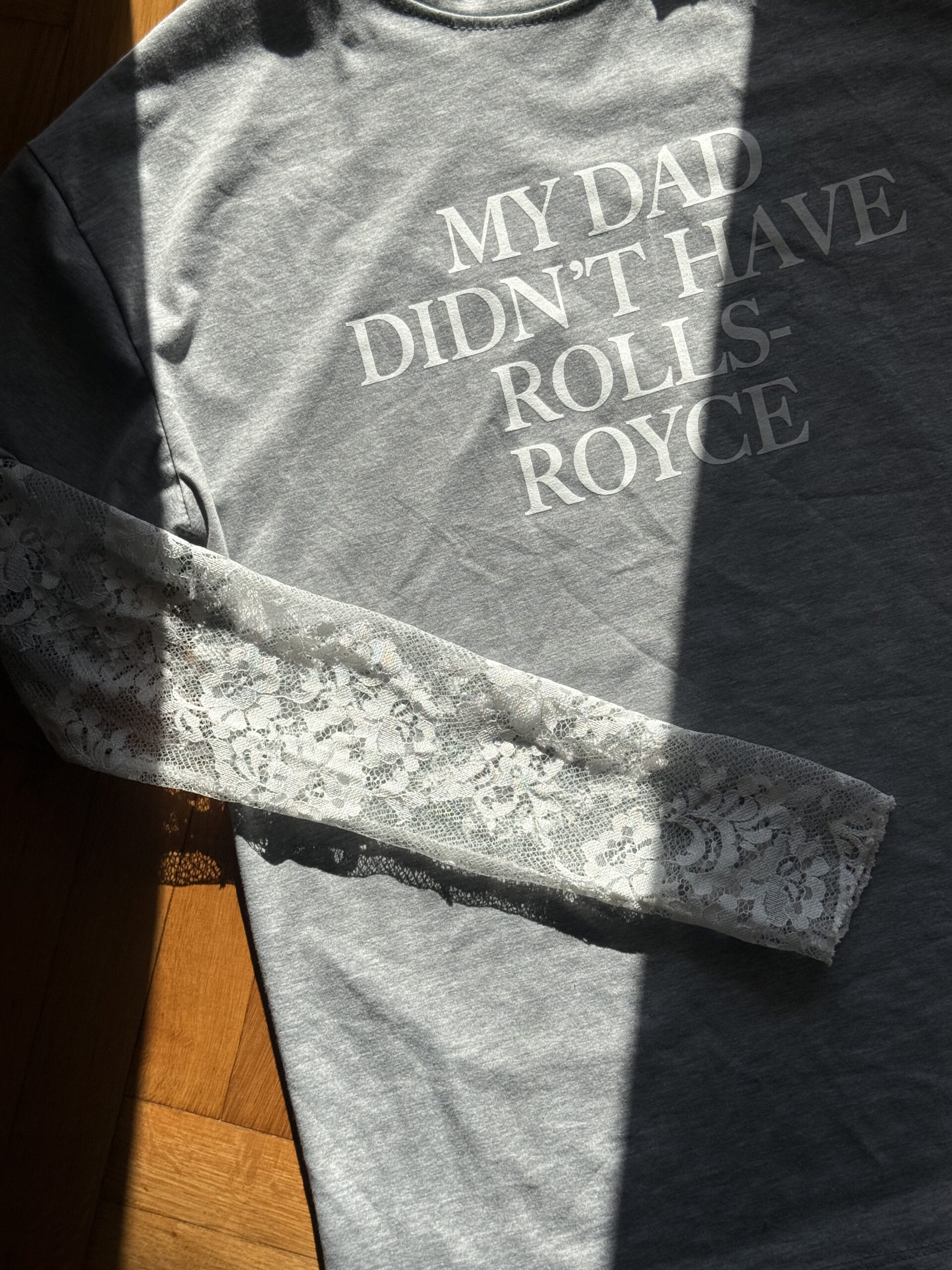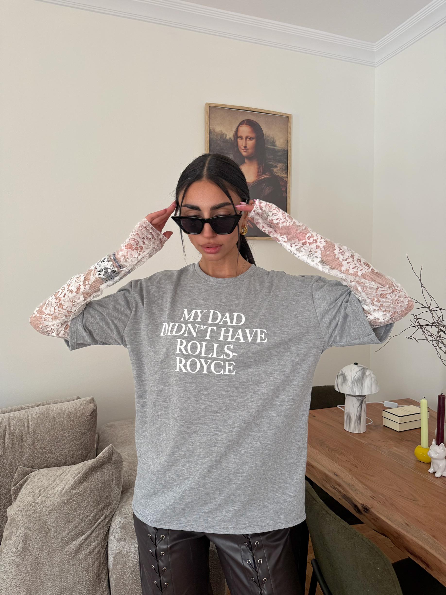 GREY OVERSIZED T-SHIRT ME STATEMENT ΤΥΠΩΜΑ ΣΤΟ ΜΠΡΟΣΤΙΝΟ ΜΕΡΟΣ. ( ΜΥ DAD DIDN’T HAVE ROLLS-ROYCE ) KAI ENTYΠΩΣΙΑΚΗ LAYERING ΛΕΠΤΟΜΕΡΕΙΑ ΜΕ ΔΑΝΤΕΛΕΝΙΑ ΜΑΝΙΚΙΑ.ΑΝΕΤΗ ΓΡΑΜΜΗ ΚΑΙ ΜΑΛΑΚΟ ΥΦΑΣΜΑ ΠΟΥ ΑΓΚΑΛΙΑΖΕΙ ΤΟ ΣΩΜΑ, ΙΔΑΝΙΚΟ ΓΙΑ ALL-DAY ΕΜΦΑΝΙΣΕΙΣ ΜΕ FASHION ATTITUDE.