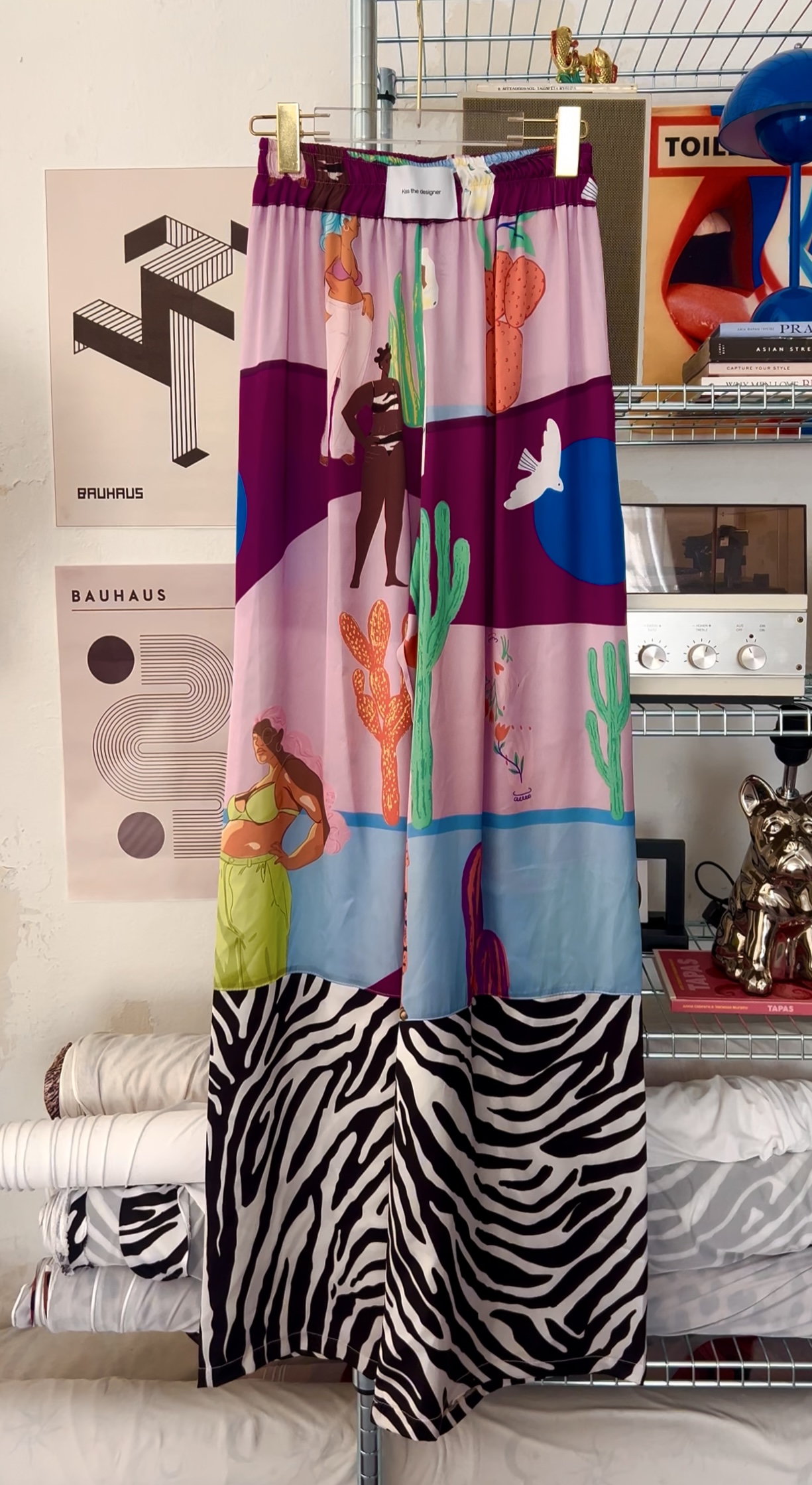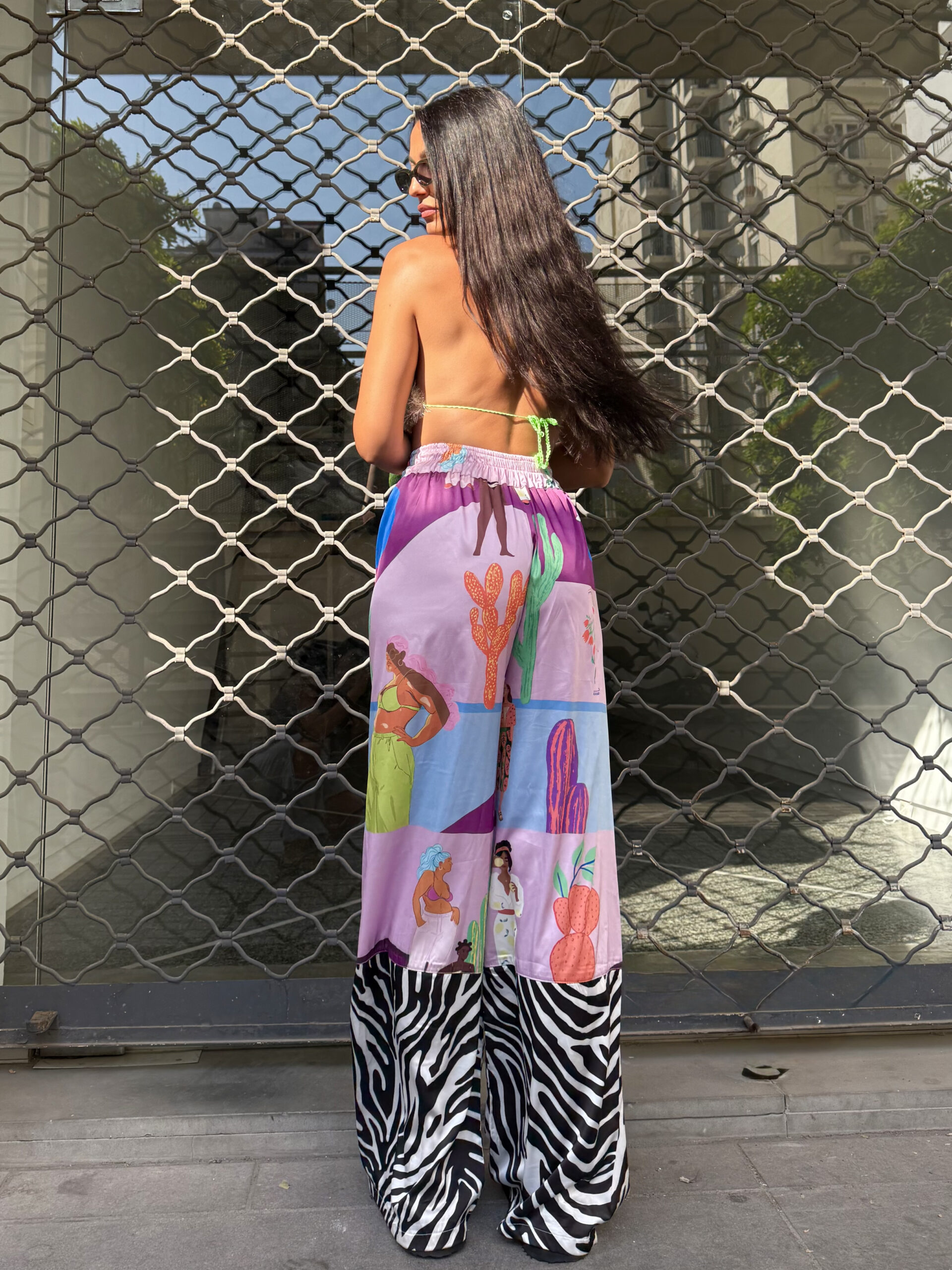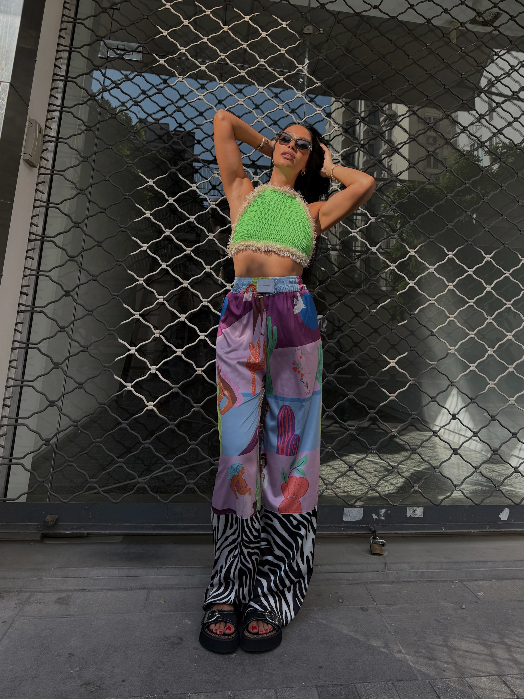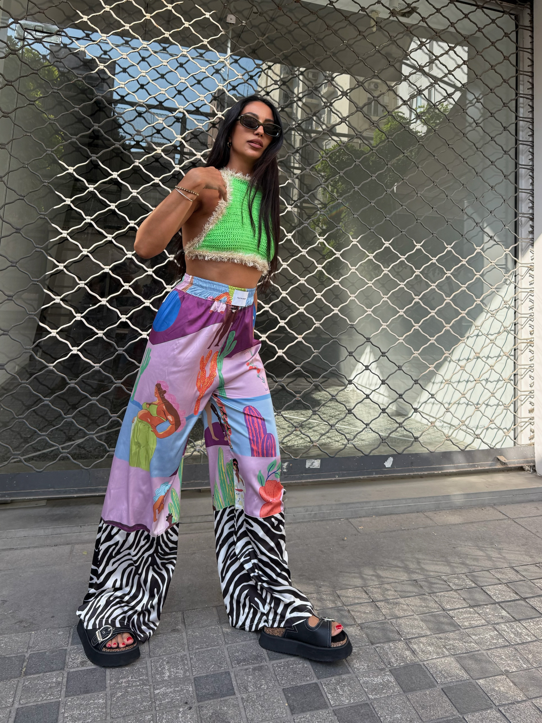 - Παντελόνα με λάστιχο εσωτερικά γύρω από την μέση . Δεν έχει πλαϊνή ραφή και τσέπη . Στο κέντρο εμπρός υπάρχει σε υφαντή ετικέτα το brand name της εταιρίας kiss the designer . Λίγο κάτω από το γόνατο είναι ραμμένο με εξωτερική ραφή το zebra print , φυσικά στο ίδιο σατέν ύφασμα .MADE IN GREECE100% polyester satin .