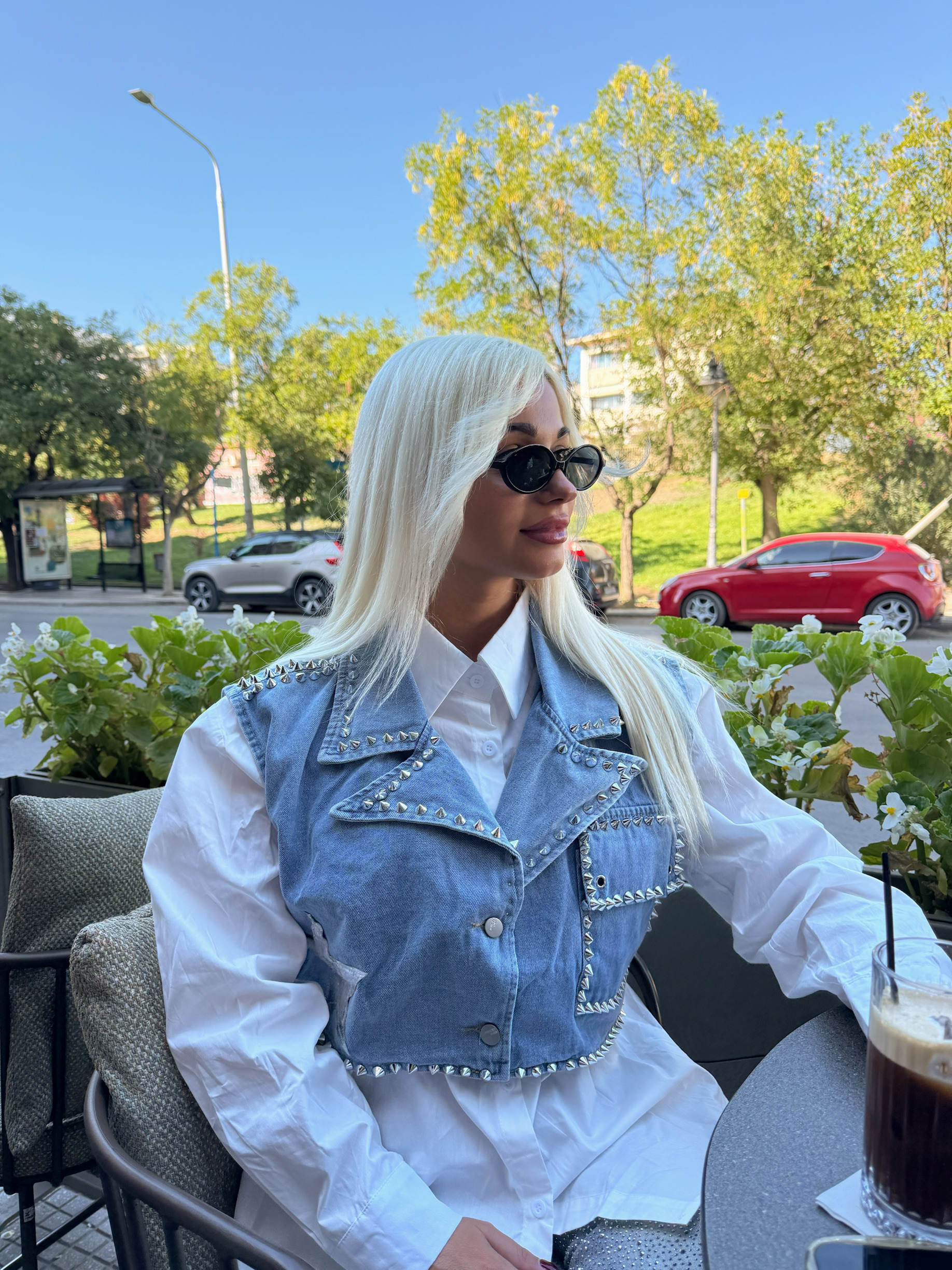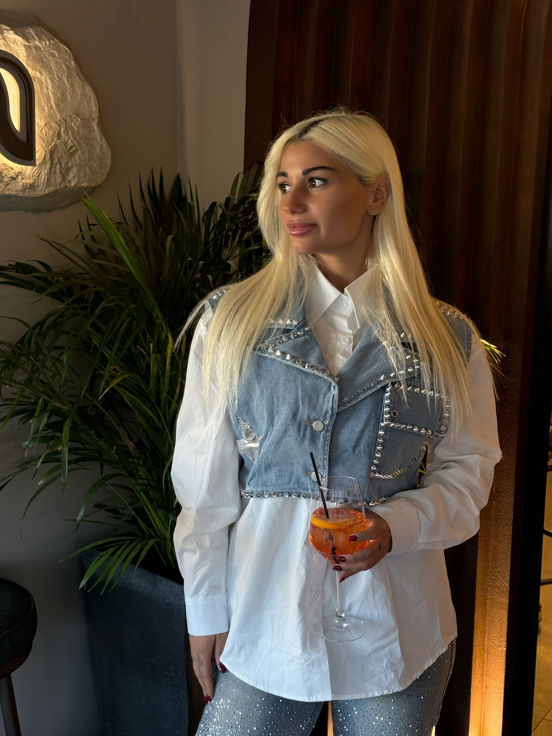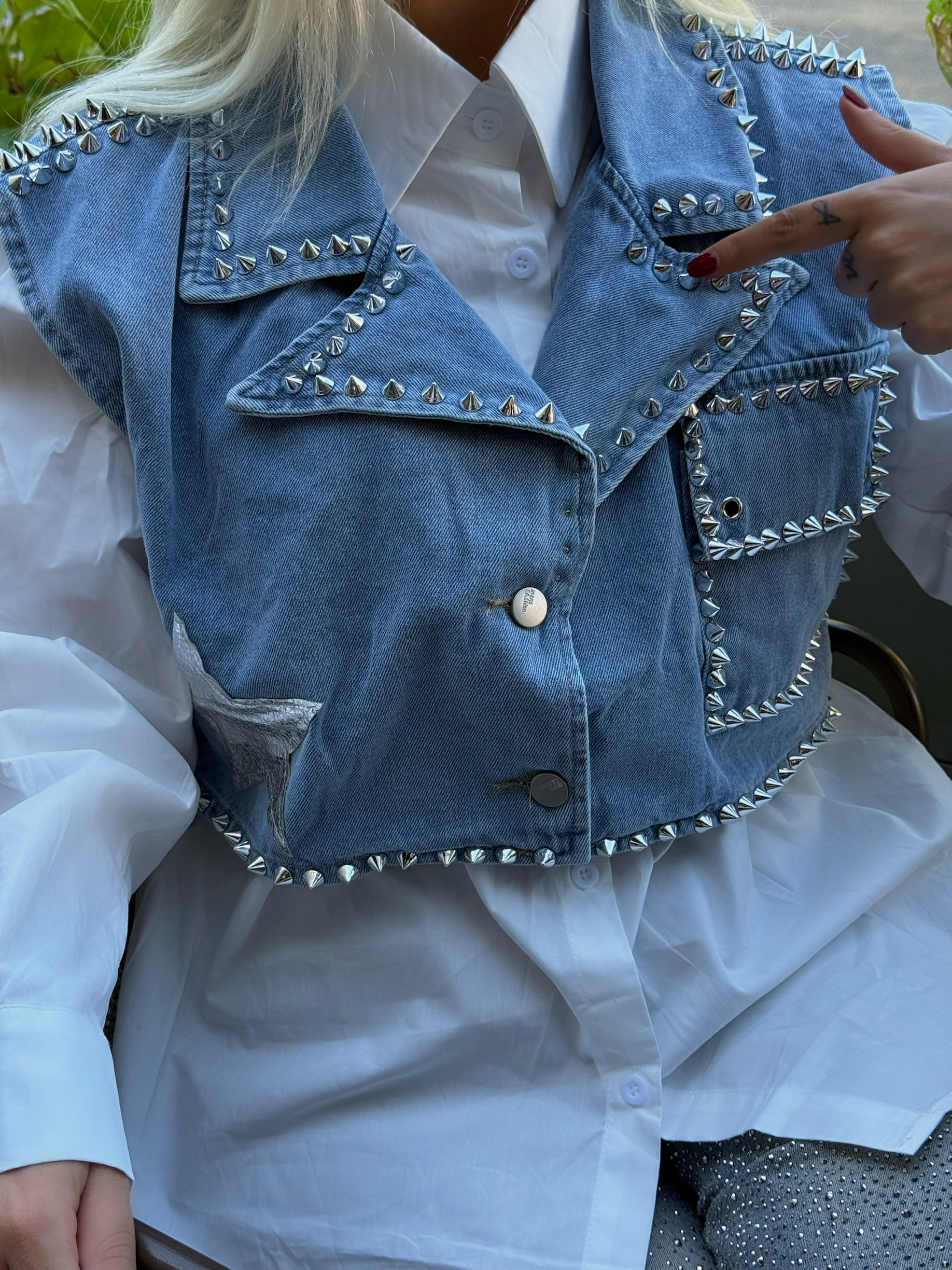 - 2 PIECES ΣΕΤ ΛΕΥΚΟ ΟVERSIZED ΠΟΥΚΑΜΙΣΟ ΚΑΙ DENIM CROPPED ΓΙΛΕΚΟ ME STANDS ΣΕ ΟΛΗ ΤΗΝ ΕΠΙΦΑΝΕΙΑ