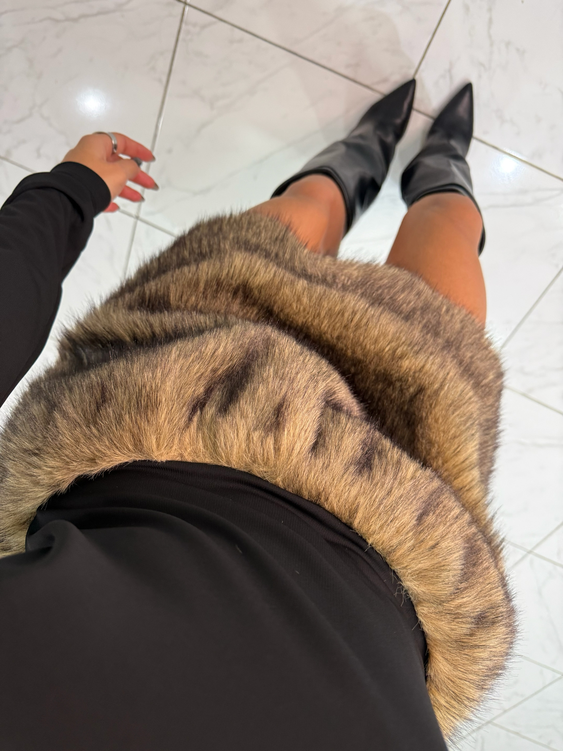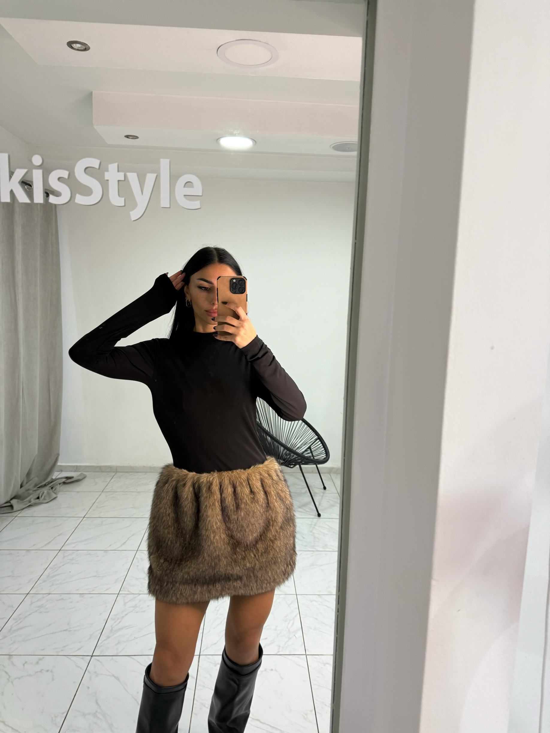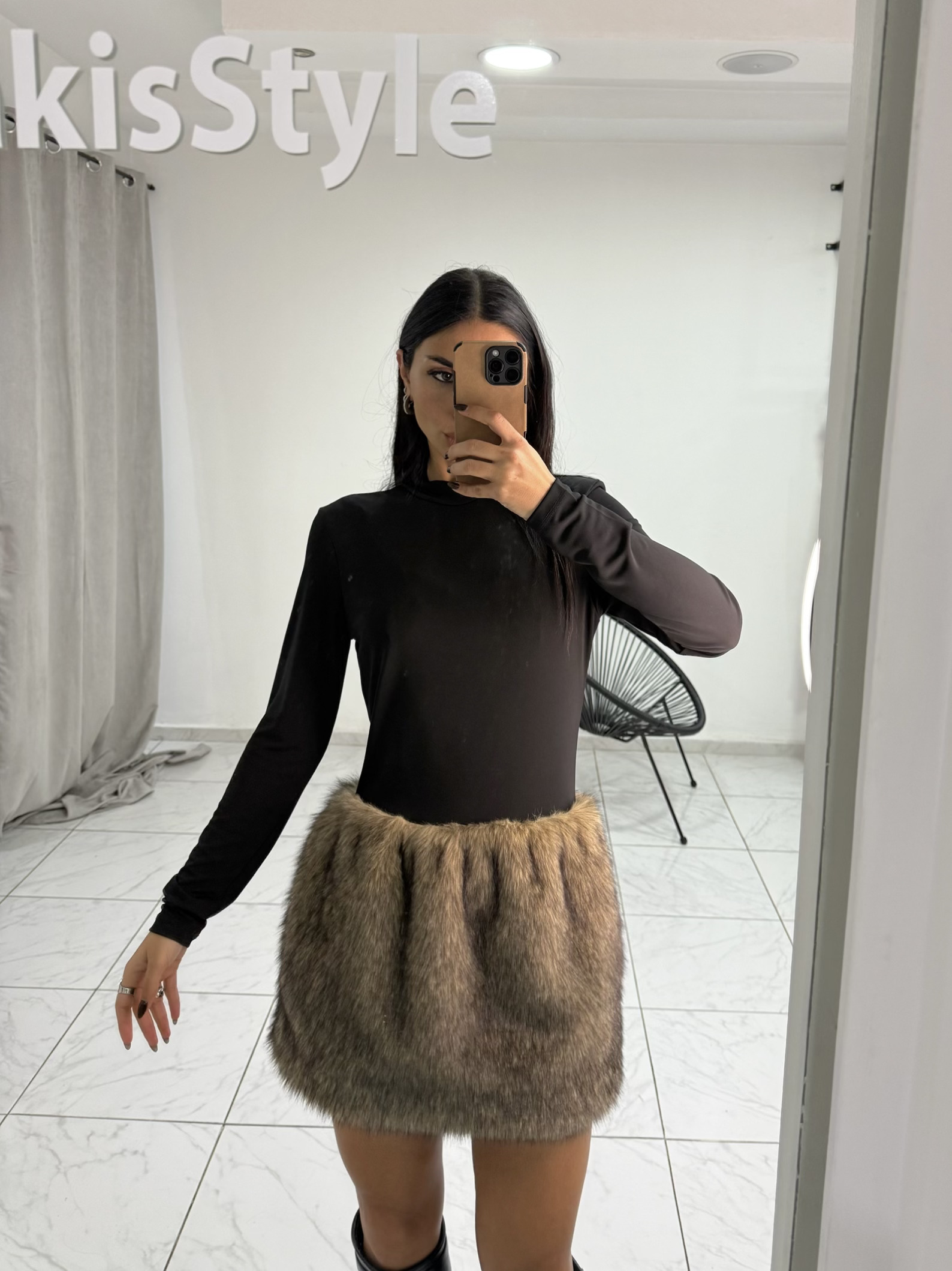 ΦΟΡΕΜΑ ΜΕ ΣΤΡΟΓΓΥΛΗ ΛΑΙΜΟΚΟΨΗ ΚΑΙ ΜΑΚΡΙΑ ΜΑΝΙΚΙΑ . ΔΙΑΘΕΤΕΙ FAUX FUR DETAIL ΑΠΟ ΤΗ ΜΕΣΗ ΚΑΙ ΚΑΤΩ.